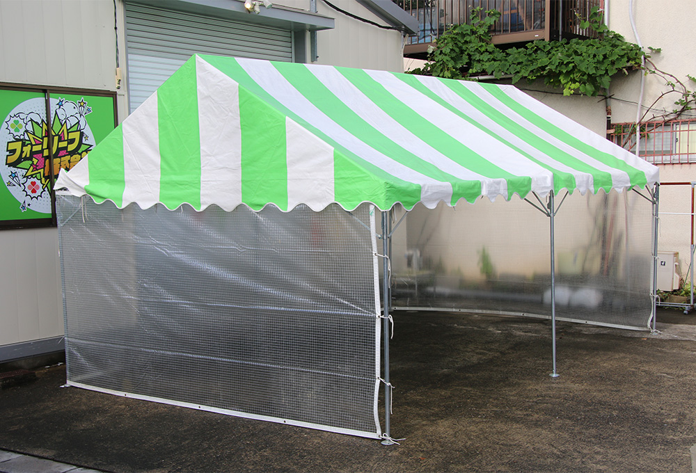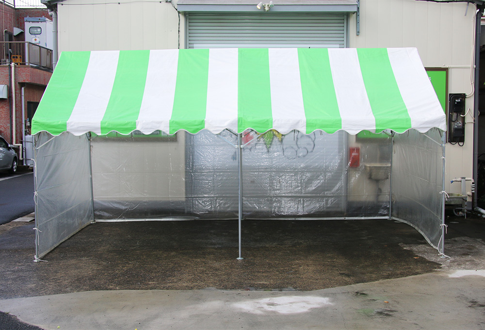 視界を遮らず、外からの様子が見え、雨風は防ぎつつ、明るさを確保することがメリットです。展示会や飲食イベントなど、視認性が重要な場面に最適です。