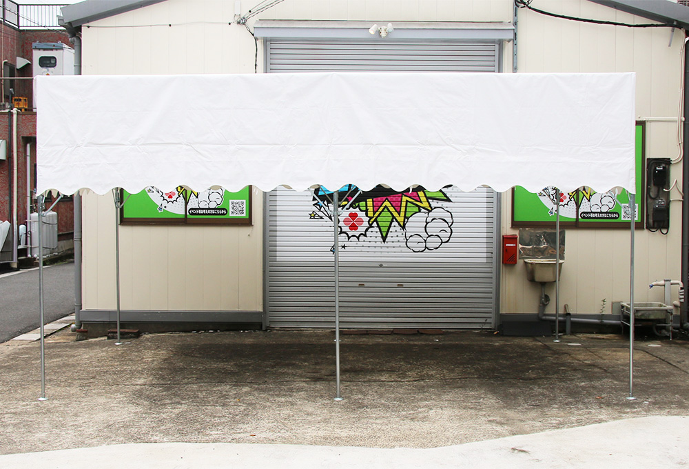 片流れタイプは、屋根が一方向に傾斜している構造のGKテントです。スタイリッシュな見た目に加え、雨水の流れを一方向にまとめられるため排水性に優れ、屋外イベントや出店ブースに最適です。