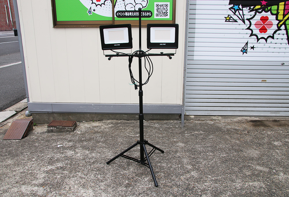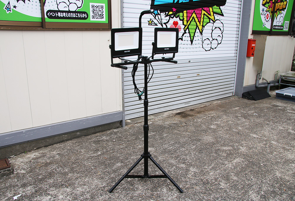 屋外イベントや夜間作業、工事現場に最適です。高さ調整可能な三脚スタンド付きで設置も簡単。